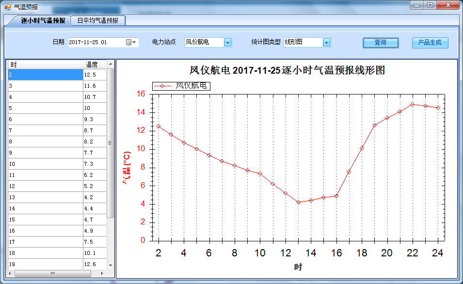 气温预报包括逐小时气温预报和日平均气温预报,主要根据预报日期、电力站点等条件,可以线形图、散点图、柱状图等统计图类型,完成气象预报数据的统计图分析制作,并完成气温预报服务产品的制作。